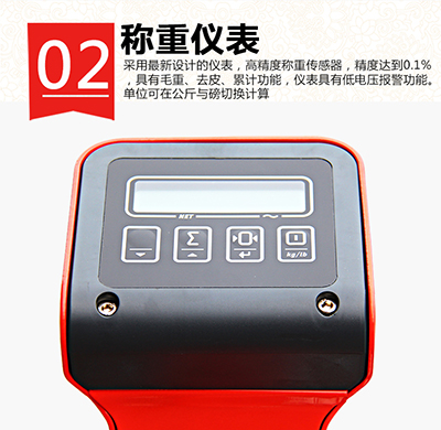 精度达到0.1%,即使是操作路面不平整,货物未放置在中心位置,精度依然很高。 累计功能 可把每批产品分多次称重,最后累加计算,以避免过载。当称重累加时,仪表上会显示一个新的读数以及托盘数,这样可以避免遗漏或重复计算。 电池容量大 仪表使用4个标准AA-电池(2.7Ah)可以满足车辆70个小时的正常称重使用。停止使用时仪表自动休眠,可以确保4200次称重,每年仅需更换一次电池(也可使用充电电池)。 仪表高清显示 在自然光下,任何角度都可以清晰的看到仪表显示的数据。 可按压的功能键 可用手指按压仪表功能键时,即使戴着手套,也能明确感受到按键被压下的“操作感”,可防止重复按键的误操作。 防水防尘 这是称重车的一个重要特性。IP65表示称重搬运车可以在室外或者货车上使用,要可以用水直接清洗车辆(低水压)车腿上的称重传感器防护等级更高。 |
