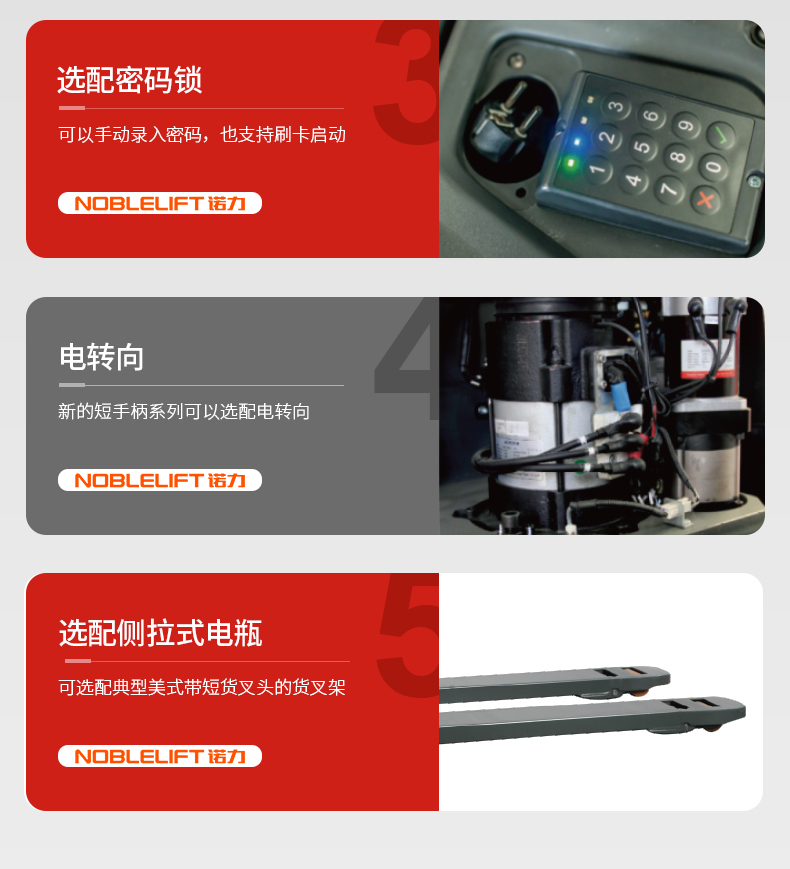 1、诺力新的短手柄系列是在多年生产经验的基础上,采用先进的技术方案和国际品牌部件,为客户提供更好的使用性能。
