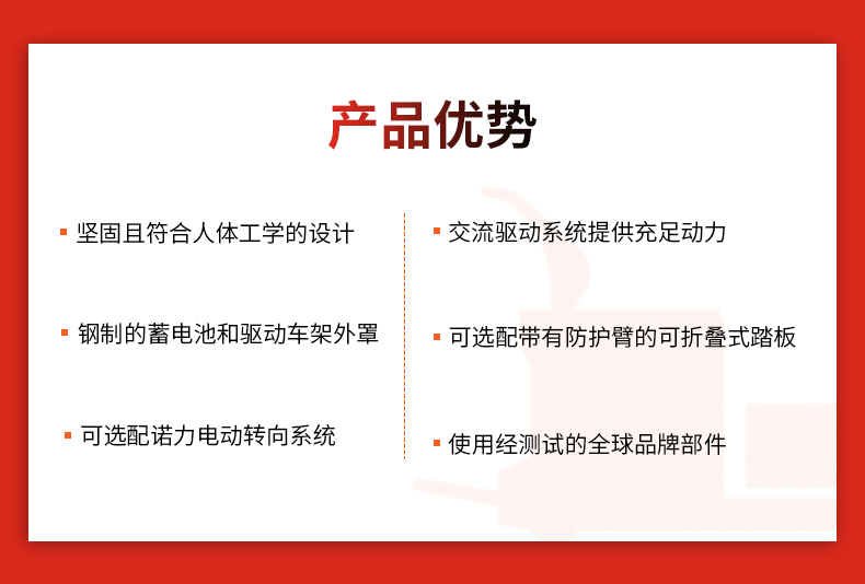 主要特点 ·交流驱动系统。 ·具有CAN-BUS总线技术且符合人体工学的手柄。 ·钥匙开关,急停开关和蓄电池电量表。 ·钢制蓄电池和驱动车架外罩。 ·可选配典型美式带短货叉头的货叉架。 ·可选配带有防护臂的悬浮可折叠式踏板。