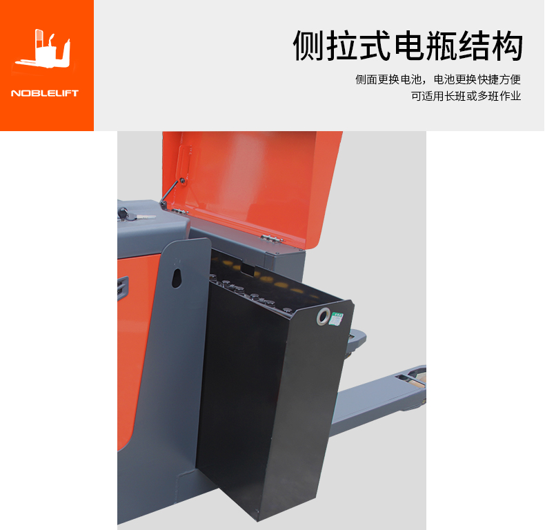 « 侧拉式电瓶结构,电瓶更换更方便快捷,可适用长班或多班作业。