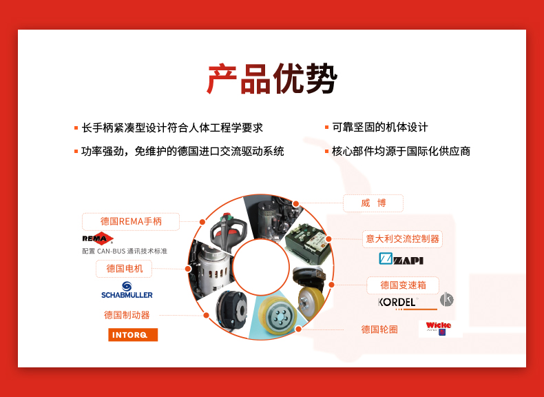 功率强劲的德国Schabmueller 免维护交流电机,加上KORDEL变速箱、INTORQ制动器和WICK驱动轮使整车如虎添翼,性能更高效和可靠,降低了运行成本。无论是平稳加速还是快速加速,交流驱动系统都能表现的淋漓尽致.