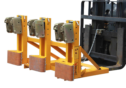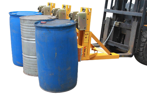 « 纯机械结构设计可与叉车方便地配合,仅依靠叉车的动作,不需要其它动力,可自动一次搬运1-3个桶。