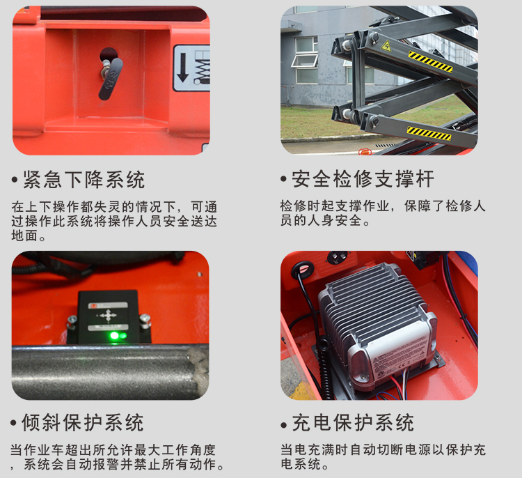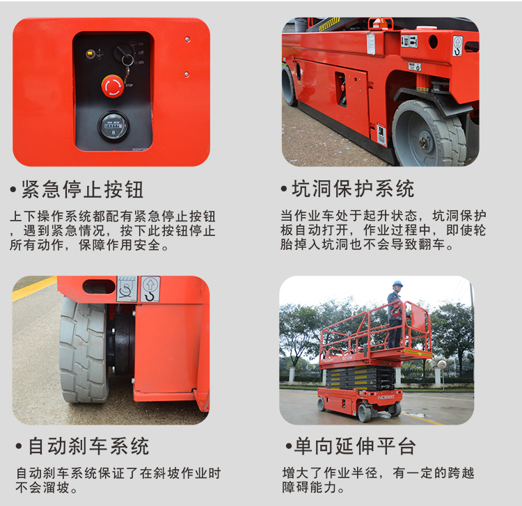 « 举升平台和底盘上分别装有操控系统和急停按钮,底盘装有紧急下降系统,