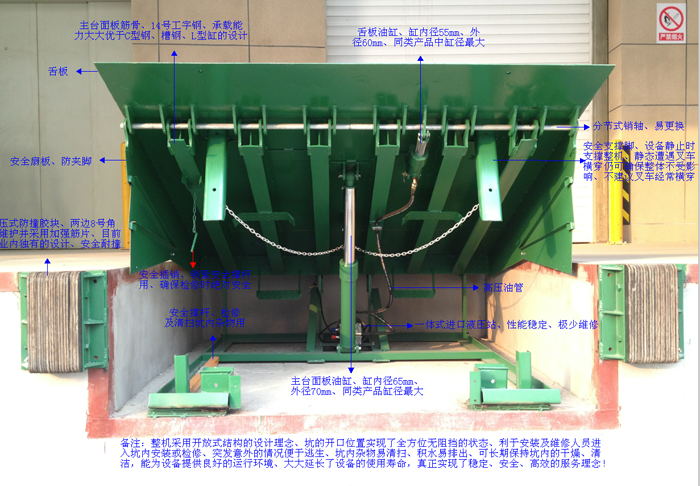 « 操作简单,只需按动按钮,平台自动升起,松开按钮,平台靠自重下降,搭在货车尾部即可使用,日常保养只需给关节加润滑油及