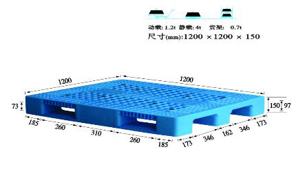 单面塑料托盘只能一面使用,表面有网格状和平板状两种,底部有川字型、田字型、九脚型。